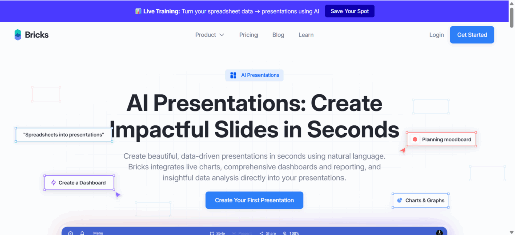 Bricks is an AI presentation tool that turns your spreadsheet data into beautiful slides with charts, tables, and analysis from your data in seconds. Just upload your data (XLSX, CSV, PDF, image file). And get a complete slide deck with editable charts, tables, and high-quality analysis that tells a story with your data. Even if you don’t have data, Bricks can pull public data from the web.