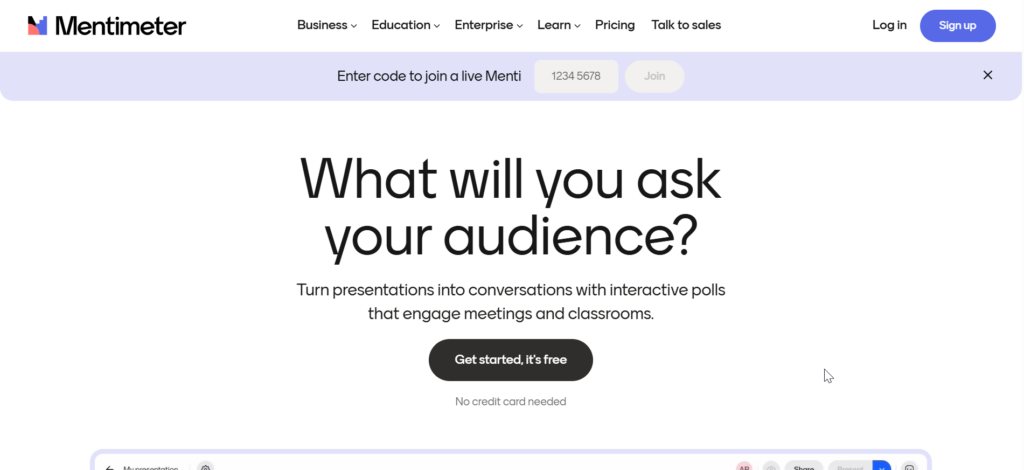 - Mentimeter turns presentations into interactive experiences with live polls, quizzes, and audience engagement tools.