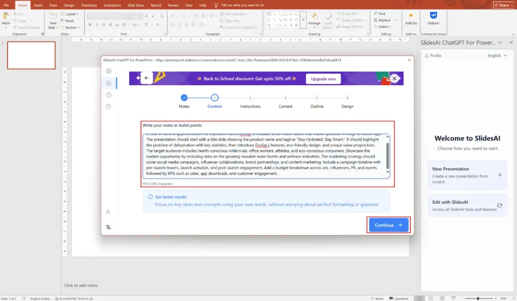 Creating a marketing presentation in PowerPoint is now easier than ever with the SlidesAI add-in. It helps you generate slides automatically based on your content and style preferences, saving time while keeping your presentation professional and visually appealing. Here’s how you can use it step by step: