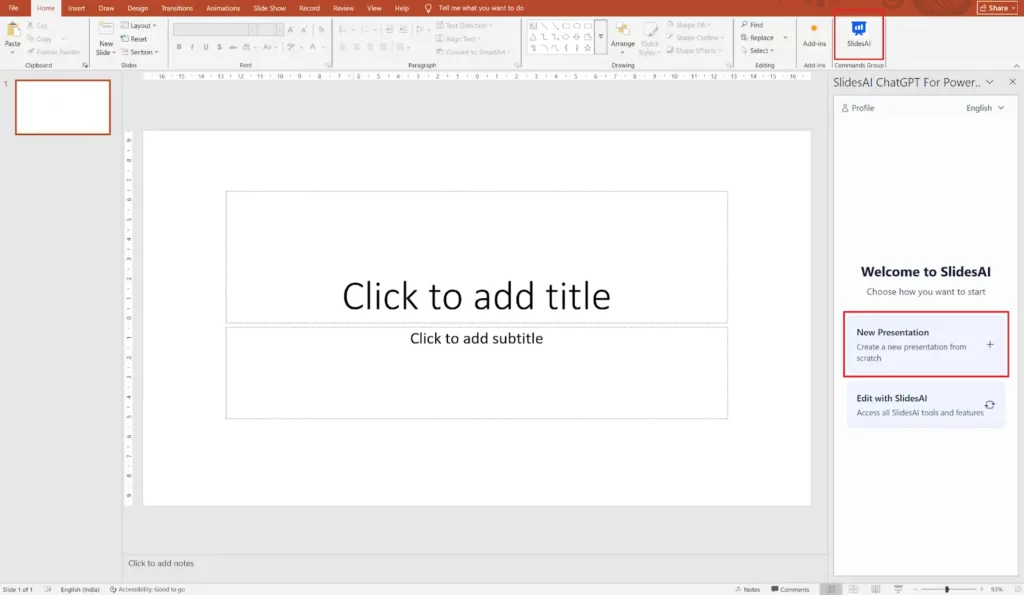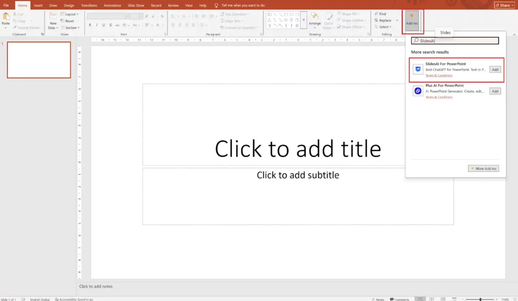 Go to Home → Add-ins → Search for “SlidesAI”, then click Add to install it.