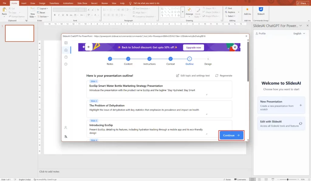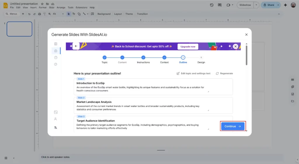 Step 7: SlidesAI will automatically generate a structured outline for your presentation. You can review it, make edits, or regenerate it if necessary.