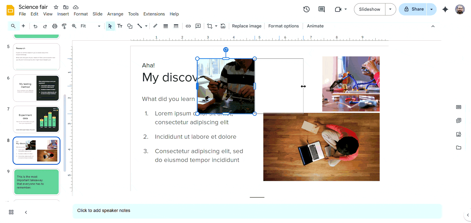 - If your image isn’t already on the slide, copy it (Ctrl + C) and paste it into your Google Slides presentation (Ctrl + V).