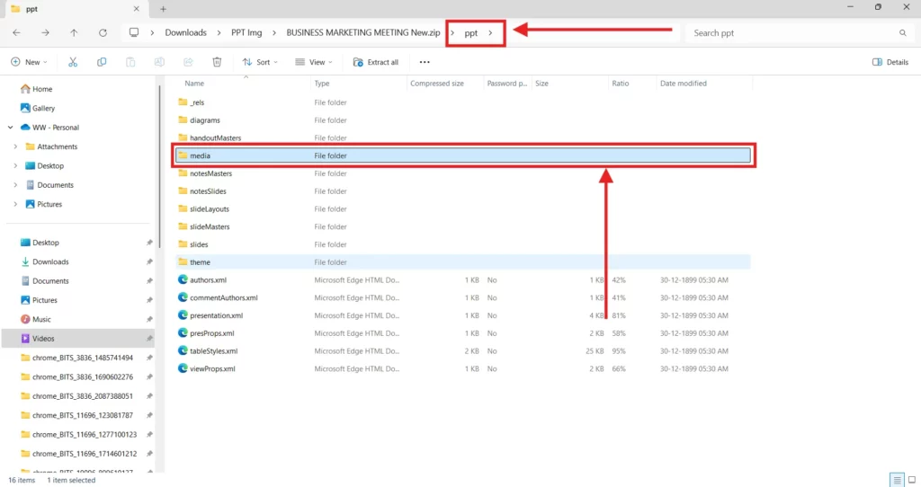 - Inside, you’ll see all the images used in your PowerPoint, saved as separate files (like PNG or JPEG).