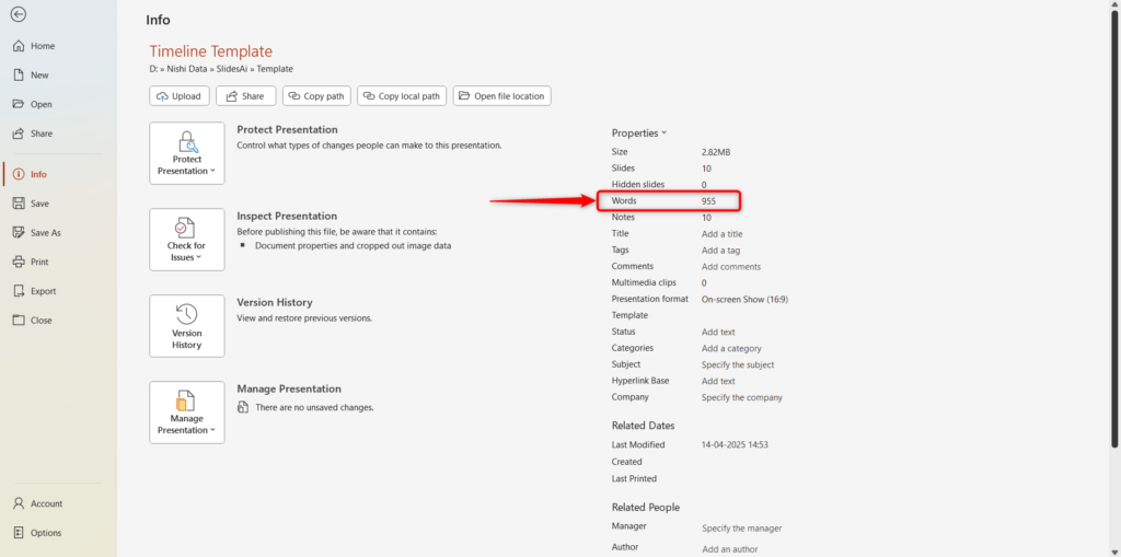If you are using PowerPoint on Windows, here’s a built-in way to get your word count.