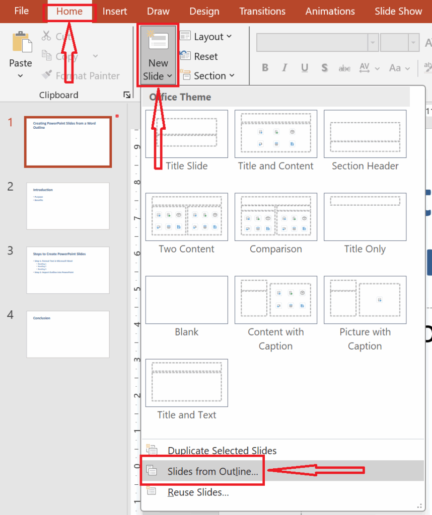 3. Open PowerPoint, go to the Home tab, click the arrow next to New Slide, and select Slides from Outline.