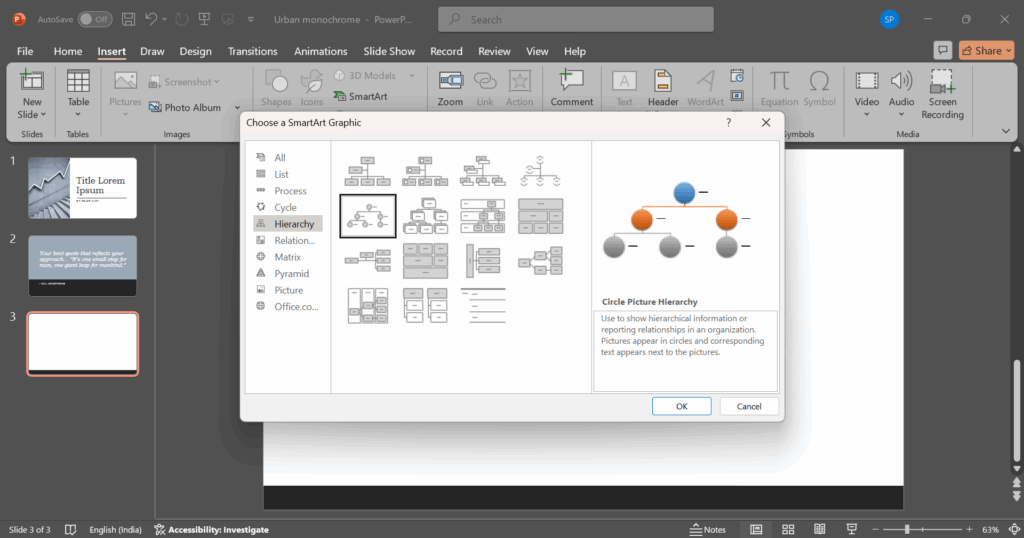 If you prefer to build your organizational chart from scratch, SmartArt in PowerPoint makes the process intuitive and flexible. Here’s how to do it step by step: