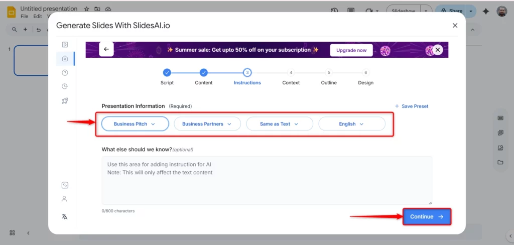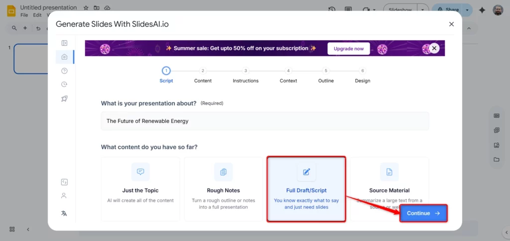 - After adding your script, click Continue to generate the slides.