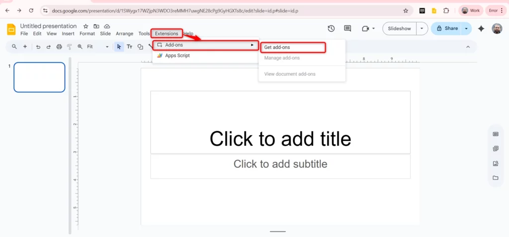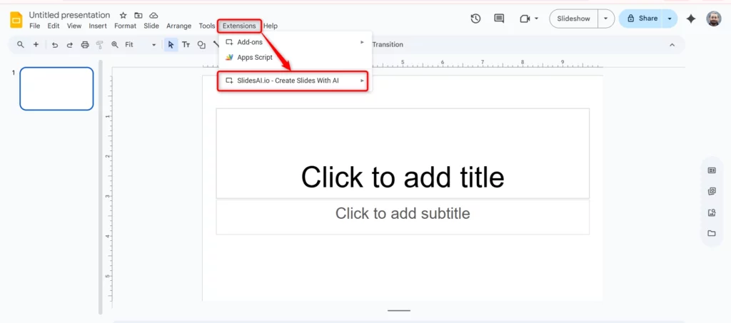 - Once installed, the SlidesAI tool will be available under the Extensions tab for easy access.