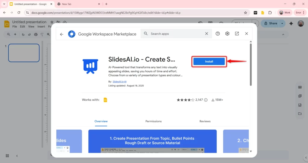 - In the search bar, type “SlidesAI” and click Install.